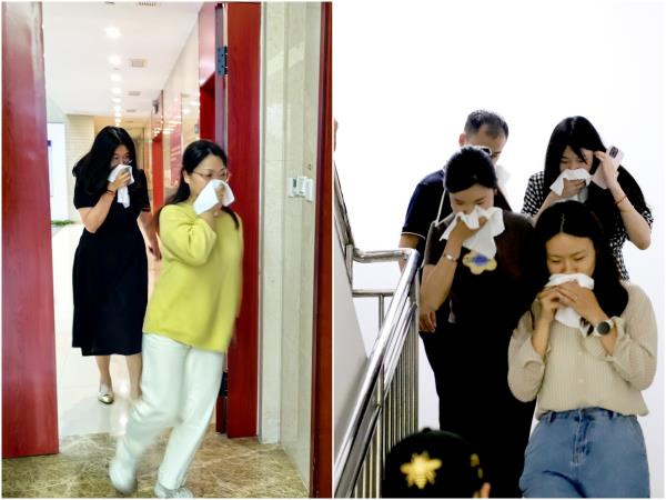 此次消防疏散演練活動以海企大廈突發(fā)火情為模擬場景,各單位人員在聽到火警鈴聲后迅速響應,手持逃生濕巾捂住口鼻,從消防樓梯有序撤離。