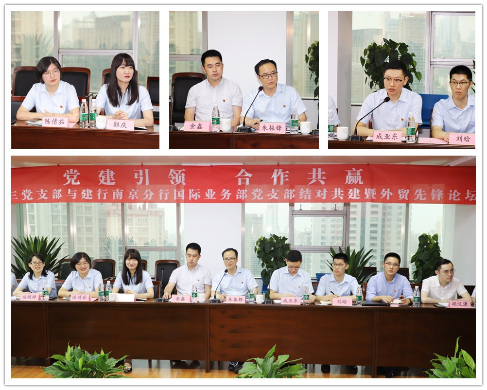 隨后,外貿(mào)公司第三黨支部書記王卓和建行南京分行國(guó)際業(yè)務(wù)部黨支部書記朱振鋒分別就各自支部的黨員構(gòu)成和黨建工作開(kāi)展情況作了交流分享,并相約在今后的共建活動(dòng)中開(kāi)展形式多樣、豐富多彩的交流活動(dòng),增強(qiáng)彼此了解,互融互通。