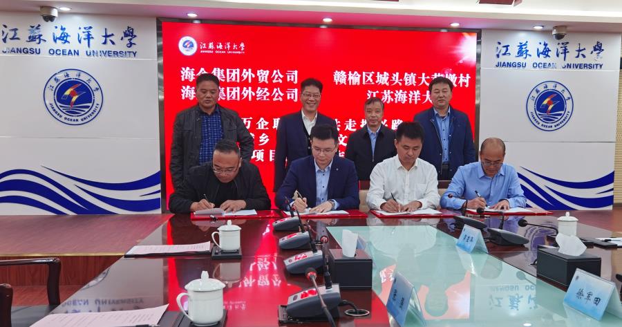 集團黨委副書記閆國倫、外貿(mào)公司黨總支副書記張強、外經(jīng)公司辦公室副主任謝沖,江蘇海洋大學副校長許興友、海洋學院院長徐軍田、副院長高煥,大黃墩村黨支部書記高峰、村主任陳學剛參加了簽約儀式。